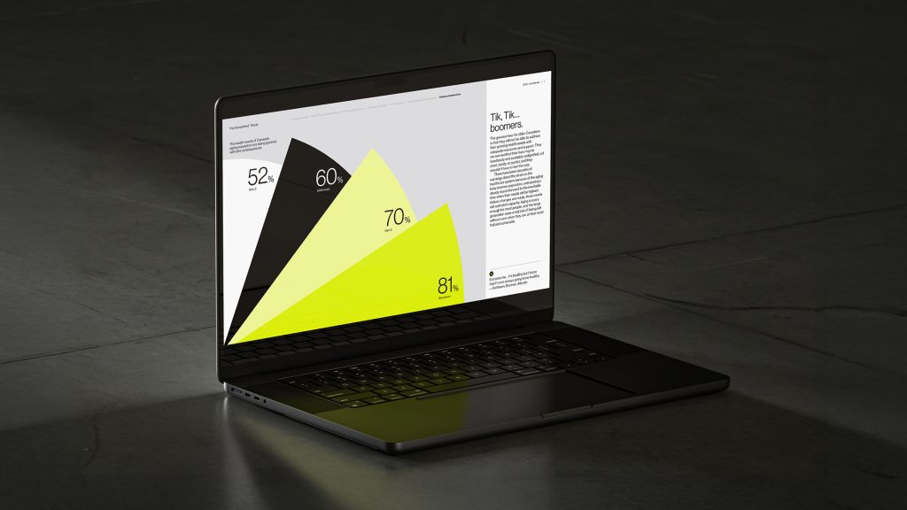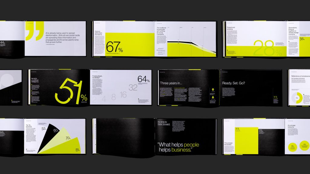 The resulting 72-page report used a strategic design system to make complex data digestible. By combining bold typography, data-driven graphics, and clean illustrations, the design transformed heavy research into an accessible, visually cohesive experience that highlights key themes affecting Canadians today.