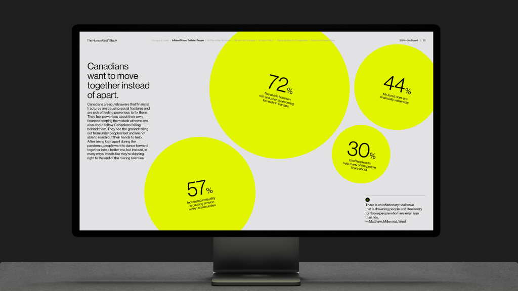 In an industry where very little sets agencies apart, Leo Canada has always differentiated itself by focusing on building brands that serve true human needs and wants. This is at the core of Leo’s philosophy called HumanKind™: an approach to creating impact for brands that focus on two things: people and their behaviour. The challenge was that while Leo would go to great lengths through custom research to gain deeper understanding and insight into people and their lives, we were limited by the lack of macro-Canadian data and research to draw from that could benefit all clients. The objective was to walk the talk and prove that no other agency better understands Canadians and how brands can solve their problems than Leo.